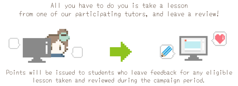1. Requests that were made with participating tutors before this campaign was announced are still eligible for point rebates as long as the lessons are taken and reviewed within the campaign period.