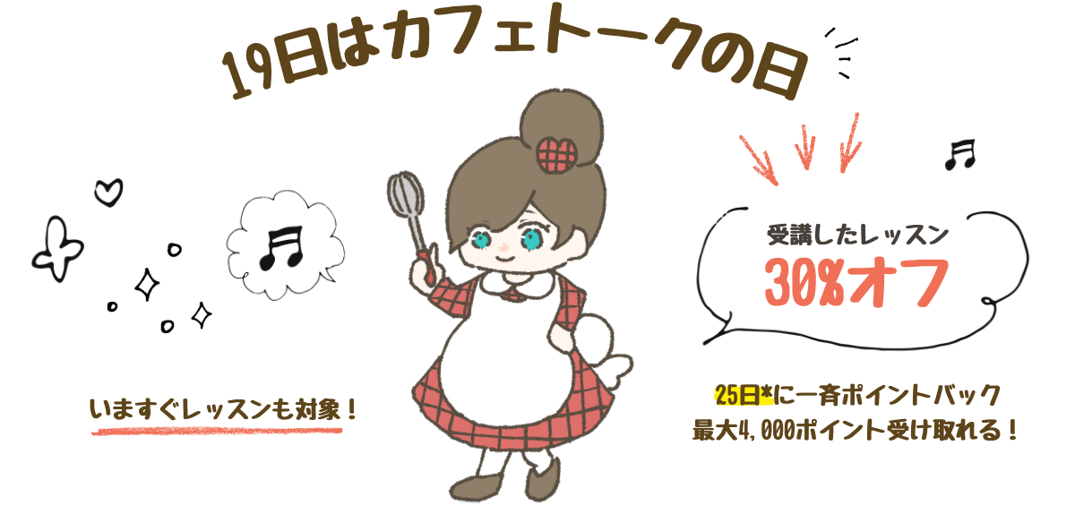 19日におすすめレッスンに掲載されているレッスンを受講すると、カフェトークの日限定バッジ*を取得できます!