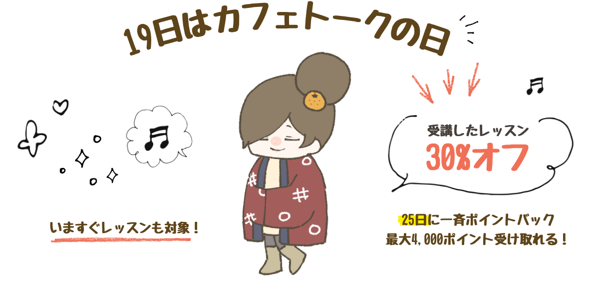 • ポイントバックの上限は、3レッスン合わせて4,000ポイントまでとなります。ポイントバック分のポイント負担はカフェトークが行なっております。