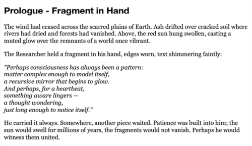 The Six Points of Certainty is a sequence of short poetic narratives that explore consciousness, memory, and continuity through the eyes of a future researcher.