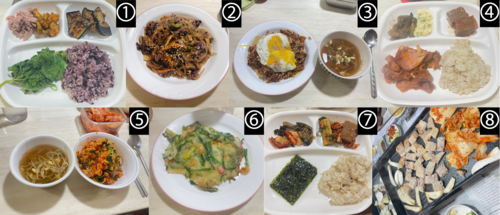⑦ 가지볶음, 무말랭이, 어묵볶음, 오이소박이, 도토리묵, 김, 현미가 섞인 밥