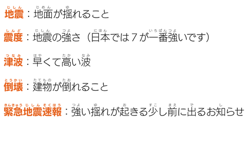 今日は、地震(じしん)のニュースでよく聞(き)く日本語(にほんご)を紹介(しょうかい)します。