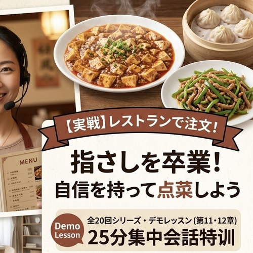 このレッスンは、中国での日常生活を完全網羅した**「実践!中国語日常会話マスターコース(全20回)」の中から、第11・12章(レストラン・注文編)を体験レッスンとして提供します。