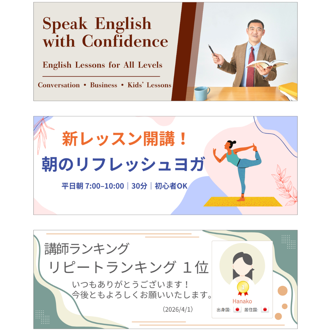 My profile video, thumbnails, profile announcements, lesson icons and additional images, column images, and teaching materials are all created using Canva. Once you master the basics, you will be able to create clean and well-organized designs easily. This lesson is also recommended for tutors who want to make their profiles and lesson pages more clear and appealing.