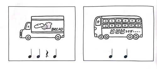 (食べ物や乗り物などの身近な言葉から、リズムにつなげていき、最終的には短いフレーズを聴いてリズムカードを選んだり、カードを正しく手拍子できるようになります)