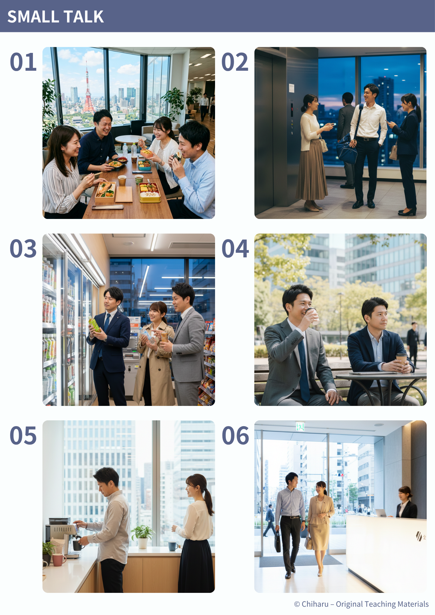 6가지 상황 중 하나를 선택하고, 동료·선배·상사 등 상대에 맞춰 말하는 자연스러운 스몰토크 능력을 키웁니다. 수업 중에는 부자연스러운 표현이나 오류를 그 자리에서 부드럽게 수정하여, 더 자연스럽고 전달력 있는 일본어로 다듬어 드립니다. BJT 대비에도 추천합니다.