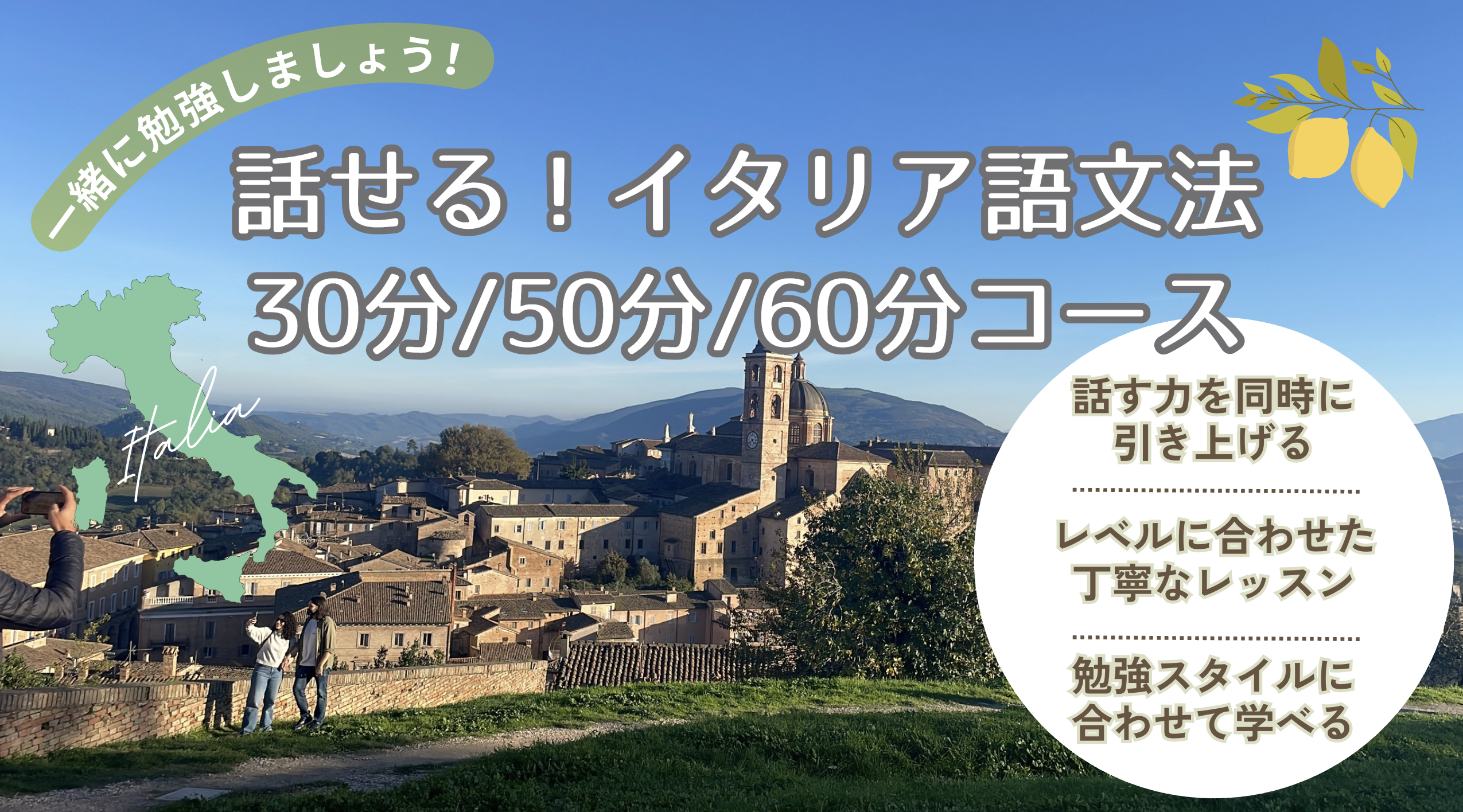 このレッスンは、「正しく話せるようになること」がゴールです。 自由に気持ちを表現できるようになるために、文法を味方にする。 そんな、大人にこそぴったりのイタリア語レッスンです。